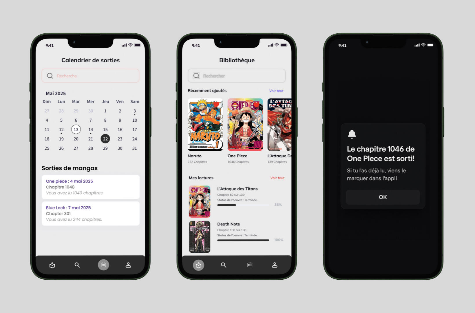 📚 Ajoute tes mangas préférés à ta bibliothèque✅ Marque les chapitres comme lus🔔 Reçois une alerte quand un nouveau chapitre sort🗓️ Visualise les sorties à venir dans un calendrier❤️ Note, commente, discute (à venir très bientôt !)
